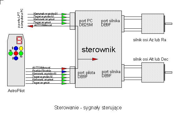 Njabardziej istotną sprawą dla zrozumienia działania systemu goto jest zestaw sygnałów sterujących i ich źródeł. Z tego punktu widzenia najważniejszym elementem sterowania jest AstroPilot dostrczający sygnały zegara i kierunku w obu osiach ale przede wszystkim sygnału AUTO/Manual . Sygnał AUTO/Manual pozwala na wybór źródła sygnałów sterujących w obu osiach napędu i jednocześnie "informuje' PC ustawiając program gotopl w stanie aktywnym lub pasywnym. Dodatkowym sygnałem sterującym jest sygnał Enable/Disable. który nie ma znaczenia z punktu widzenia systemu sterowania napędem a pozwala jedynie na zmniejszenie poboru energii w trakcie przerw w obserwacji odłączając sterownik silników od zasilania. Absolutnie minimalnym zestawem sygnałów sterujących są 2 pary (zegar i kierunek) sygnałów dla każdej z osi oraz sygnał pracy ręcznej lub automatycznej - AUTO/Manual. Z tego punktu widzenia sterownikiem może być dowolny układ rozumiejący opisany zestaw sygnałów i potrafiący go wykorzystać do poruszenia silników napędu. Z tego punktu widzenia także pilotem może być dowolne urządzenia potrafiące dostarczyć opisany zestaw sygnałów. I w końcu program gotopl działać będzie z dowolnym ukladem elektronicznym potrafiącym dostarczyć mu przez port LPT jednego sygnału sterującego AUTO/Manual (pin 15 portu LPT z poziomem 0) oraz potrafiący odebrać z tego portu 2 pary sygnałów sterujących (zegar i kierunek) z pinów 2-5 portu LPT. Wszystkie uzywane w tym rozwiązaniu sygnały pracują w logice TTL.