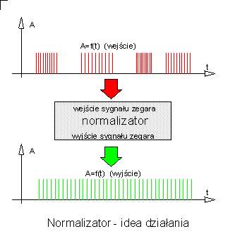 Układ normalizatora sygnału związany jest z koniecznością dostarczenia sterownikom impulsów sterujących w odpowiedniej sekwencji. Cechą programu gotopl jest to, że sygnały sterujące generowane są w formie 'paczek' co kilkaset ms. Jest to cecha zarówno wybranego algorytmu sterowania jak i systemu Windows, który nie będąc systemem czasu rzeczywistego nie gwarantuje do końca dostarczenia sygnałów w zaplanowanej postaci. Jak pokazano na rysunku, paczki impulsów zegarowych przechodząc przez normalizator zostają zliczone i uśrednione w czasie dająć w efekcie równomierny strumień impulsów zegarowych sterujących każdą z osi. Normalizacja odbywa się dla każdej z osi oddzielnie i podlegają jej tylko sygnały zegarowe osi. Sygnały kierunku ze względu na swój charakter nie podlegają normalizacji ale stanowią istotną część algorytmu normalizacji.