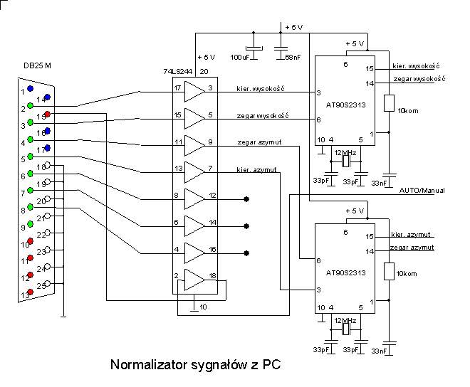 Pokazany na rysunku normalizator dołączony jest do zewnętrznego portu DB25M połączonego już bezpośrednio z portem LPT komputera PC działającego z programem gotopl. Kabel łączący normalizator (sterownik) z PC to prosty kabel 1-1 z co najmniej 6 przewodami (5 sygnałowych i 6 wspólny). Sprawdzona długość tego kabla wynosi nie mniej niż 10m choć wydaje się, że może być jeszcze dłuższa. W zasadzie układ sterownika może nie posiadać normalizatora ale wtedy można będzie zaobserwować 'szarpaną' pracę napędu szczególnie dla dużych wartości wysokości obiektu. Efekt ten można łagodzić dobierając parametr "DELTA" na pulpicie programu gotopl, który to parametr dobiera opóźnienie pomiędzy impulsami zegarowymi dla obu osi. Właściwa normalizacja odbywa się za pomocą programu mikrokontrolera AT90S2313, który zlicza dochodzące na jego wejście impulsy, uśrednia ich ilość w pewnym czasie po czym generuje taką samą ilość impulsów o dużej równomierności na wyjściu. Normalizacji podlegają wyłącznie sygnały zegarowe dla obu osi. Sygnały kierunku 'przechodzą' przez normalizator bez zmian. Normalizator spełnia z programem gotopl dodatkową rolę. Buforuje sygnały sterujące (zlicza szybko docierające do niego sygnały zegarowe i przeechowuje je na tyle długo aby nie pogubiły ich silniki krokowe) pozwalając aby program gotopl szybciej wykonał swoją część związaną ze sterowaniem co w znacznym stopniu poprawia wygodę użytkownia programu. |