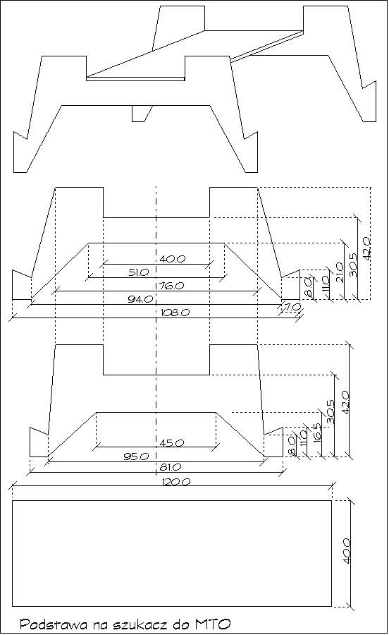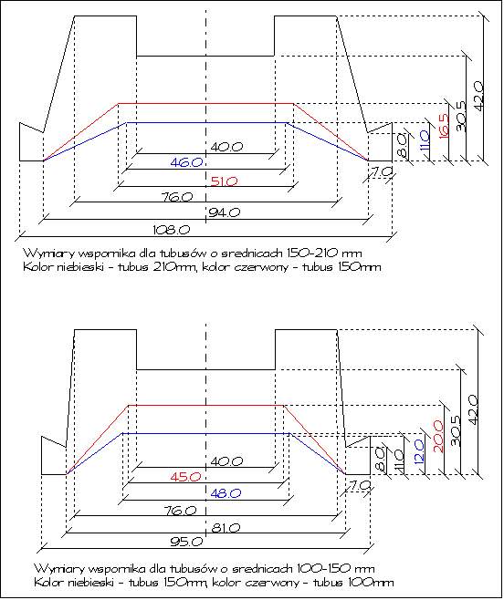 | Na sąsiednich rysunkach podaję wymiary wsporników pionowych elementów wspornika szukacza dla tubusów o rozmiarach 100-150mm oraz 150-210mm. 210mm ma tubus do popularnego 'szukacza komet'. Odpowiednim kolorem zaznaczyłem wymiary detali pasujących optymalnie do podanego rozmiaru tubusa jakkolwiek wspornik wykonany np. dla tubusa 100mm 'od biedy' pasował będzie dla tubusów o większych rozmiarach np. 120, 150mm. Zasada ta nie obowiązuje w drugą stronę tzn. wspornik przeznaczony od razu dla tubusa 210mm nie nadaje się do zastosowania z mniejszymi rozmiarami tubusów. Poziomy element wspornika jest taki sam jak w opisanym wsporniku do MTO czyli ma rozmiary 40/120mm. | ![]() |