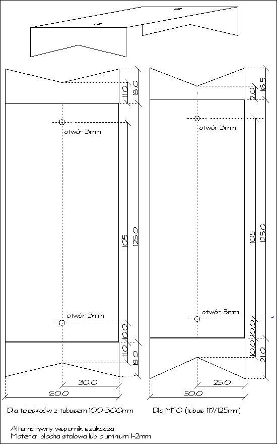 | Testy wykazały, że wsporniki wykonane z laminatu są dość delikatne. Następną propozycją jest wspornik wykonany z blachy stalowej lub aluminiowej wykonany z jednego kawałka blachy wygiętej z obu stron. Dla MTO zaginane części mają różne długości bo opierane są w róznychmiejscach tubusa mającego różne średnice. Sam szukacz montowany jest do wspornika za pomocą wkrętów wkręcanych do podstawy szukacza (podstawę D należy uzupełnić w dwie nalutowane nakrętki M3) | ![]() |