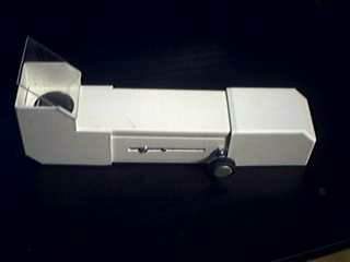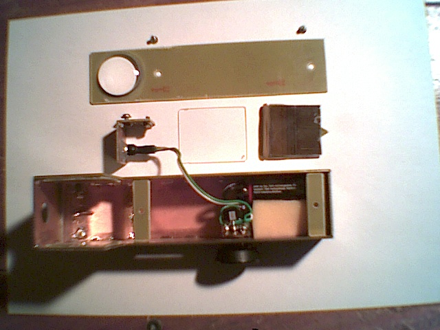 Na tym zdjęciu widać kilka głównych elementów szukacza: obudowę z potencjometrem i baterią, diodę LED na wsporniku, ekran projekcyjny, lustro na wsporniku, pokrywę z soczewką. W obudowie widać dwa poziome wsporniki do których mocowana jest pokrywa. Zdaję sobie sprawę, że samodzielne przygotowanie niektórych elementów szukacza może być trudne. Napisz do mnie jeśli jesteś zainteresowany samodzielnym wykonaniem szukacza. Jeśli przyślesz mi zwrotną kopertę A5 ze znaczkiem to odeślę Ci kliszę celownika (1, 4.2, 8.4 stopnia) oraz rysunki elementów obudowy na papierze samoprzylepnym co znakomicie ułatwia wykonanie szukacza. |