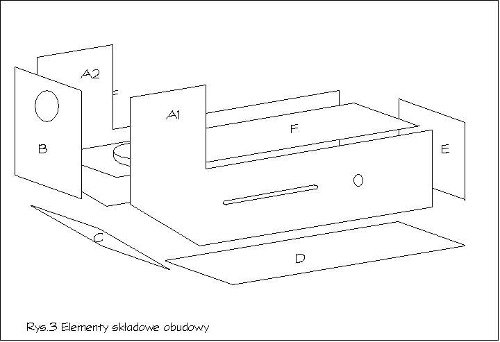 Na rys.2 pokazane są składowe elementy obudowy szukacza wykonane z laminatu epoksydowego (zalecam użycie laminatu szklanego o grubości ok. 1.5mm) jednostronnie foliowanego miedzią. Elementy konstrukcji zwrócone są stroną miedziowaną do środka a całość obudowy powstaje poprzez zlutowanie krawędzi poszczególnych części ze sobą. Boki szukacza A1 i A2 są symetryczne lustrzanie z tym, że w części A1 wykonany jest otwór na potencjometr i szczelina na regulację ustawienia położenia diody LED. Pokrywa szukacza -F utrzymuje także wklejoną soczewkę i nie jest lutowana do obudowy ale jest przykręcana do dwóch poziomych rozpórek lutowanych do części A1 i A2.. |