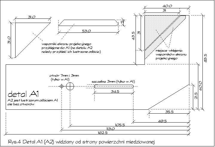 Na rys.4 pokazane są wymiary boków szukacza. Dla przypomnienia okrągłe otwory na potencjometr oraz podłużny otwór regulacyjny ostrości obrazu celownika wykonywane są tylko w części A1. Na rysunku pokazane są także detale służące do prowadzenia i mocowania ekranu projekcyjnego oraz miejsce ich zamocowania 'od wewnątrz' konstrukcji szukacza na ściankach bocznych A1 i A2. Elementy te należy nakleić na zaznaczone pola za pomocą kleju 'poxipol - 10 minut' wstawiając na czas klejenia pomiędzy nie ekran projekcyjny Pomaga to we właściwym ustaleniu dystansu pomiędzy wspornikami ekranu projekcyjnego na ok. 1.3-1.4mm (grubość płytki ekranu). |