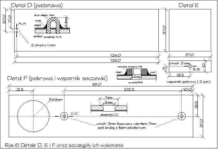 Na rys.6 pokazane są wymiary kolejnych elementów: D (podstawy z punktem mocowania wspornika lustra) płytki spodniej z regulacją położenia lustra, E (ścianki tylnej) oraz F (pokrywy z mocowaniem soczewki). Punkt mocowania wspornika lustra to wlutowany w detal D drut miedziany 1mm wygięty w kształcie 'uszka', w które wstawiany jest ukośny koniec wspornika lustra. Soczewka wklejona jest w pokrywę F (klej 'poxipol 10 minut') a otwory mocujące pokrywę mają fazowanie pod wkręty z łbem stożkowym M3. Pokrywa mocowana jest do obudowy za pomocą 2 wkrętów wkręcanych we wsporniki pokrywy. Wsporniki wlutowane są do obudowy, pomiędzy boki A1 i A2 ok. 1.5mm poniżej krawędzi boków tak, aby pokrywa po założeniu zrównana była z krawędzią boków. |