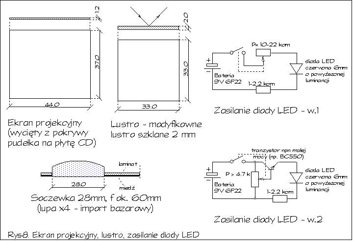 Na rys.8 pokazane zostały ostatnie elementy wchodzące w skład budowy szukacza. Soczewka - tu pokazana jak powinna być wklejona w pokrywę, wyjęta została z kupionej na bazarze lupy oznakowanej x4. Soczewka ma średnicę ok. 28mm i ogniskową ok. 60mm. Ekran projekcyjny powinien być możliwie cienki, sztywny i przejrzysty. Pokrywka z pudełka na CD to moja propozycja. Układ pracuje z niewielkimi zniekształceniami. Możesz eksperymentować z innymi materiałami sam. Podałem 2 sposoby zasilania diody LED - pierwszy wymaga liniowego potencjometru 10-22k z wyłącznikiem, drugi pracuje z dowolnym potencjometrem liniowym większym od 4.7k z wyłącznikiem i zapewnia płynniejszą regulację natężenia światła. Lustro to zwykłe lusterko na szkle 2mm ale odbijające stroną z warstwą srebra - jak to zrobić czytaj w opisie technologii wykonania szukacza. |