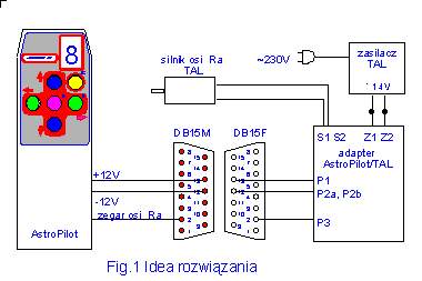AstroPilot może współpracować z napędem teleskopu TAL. Wykorzystuje się w tym przypadku sygnał zegara osi Ra/Az, który dostarcza impulsów sterujących dla silnika synchronicznego mechanizmu zegarowego teleskopu TAL. Silnik zegara teleskopu TAL musi być zasilany napięciem zmiennym ok. 16V o częstotliwości 50Hz. Astropilot wytwarza częstotliwość 50Hz, która poddawana jest wzmocnieniu we wzmacniaczu AstroPilot/TAL. W efekcie silnik synchroniczny mechanizmu napędowego teleskopu TAL zasilany jest kwarcowo stabilizowanym napięciem ok. 16V/50Hz a AstroPilot pozwala na wykorzystanie przy sterowaniu prawie wszystkich swoich zaawansowanych funkcji. |