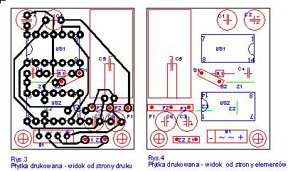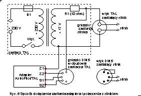 Układ wzmacniacza sygnału z AstroPilota zasilany jest z zasilacza TAL-a. Na rysunku 5 pokazany został schemat tego zasilacza oraz sposób dołączenia wzmacniacza do zasilacza. Sam wzmacniacz umocowany został wkrętami wewnątrz zasilacza na dwóch wspornikach izolacyjnych a gniazda połączenia z AstroPilotem (P) oraz połączenia z silnikiem (Z) osadzone zostały w obudowie zasilacza po lekkim powiększeniu istniejących w niej naturalnych otworów. Ze względu na moc wydzielającą się w układach scalonych US1 i US2 zaleca się przyklejenie do ich obudów radiatorów z blachy o powierzchni od kilku do kilkunastu centymetrów kwadratowych.