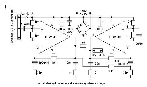 Sterownik z układami LM380 ma ograniczenia związane z mocą, które można ominąć używając innych wzmacniaczy zintegrowanych. Szczególnie dobrze spisuje się tu układ TDA2040, który jest bardzo dobrze skompensowany wewnętrznie, ma wbudowane systemy przciążeniowe i pracuje w szerszym zakresie mocy nić LM380. Para układów TDA2040 znakomicie nadaje się do zasilania silników synchronicznych na napięcie 24V. W układzie użyta została też dioda zenera 9.1V ograniczjąca napięcie zasilania dla AstroPilota. Jeśli układ nie będzie pracował przy napięciu wyższym niż 15V to należy zamiast tej diowy wlutować zworę. |