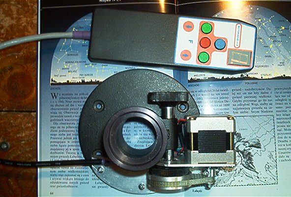 . Wspornik silnika mocowany jest do podstawy wyciągu za pomocą 3 wkrętów M3 o długości 5mm. W tym celu należy w podstawie wykonać 3 otwory gwintowane M3. Zastosowany silnik to silnik bipolarny typu 39BYG402B lub podobny o kroku 1.8 stopnia, momencie nie mniejszym niż 20Ncm oraz rezystancji uzwojeń >10 ohm. Skok wyciągu to 32mm na 2.5 obrotu pokrętła czyli 12.8mm/obrót. Zastosowany sterownik steruje silnik w tzw. półkroku podwajając rozdzielczość silnika do 400 kroków. Biorąc pod uwagę, że przekładnia paskowa redukuje dodatkowo ruch w proporcji 3:1 to całkowita dokładność wyciągu nie będzie lepsza niż: 32/2.5/3/400=11um (mikrometrów na 1 skok silnika) co z zapasem wystarcza do astrofotografii.
